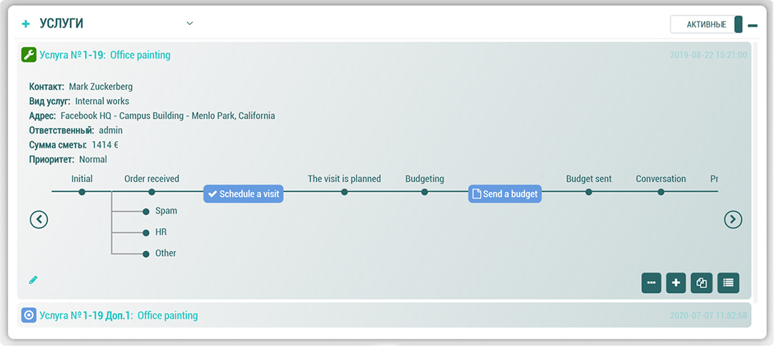 Thanks to the flexible configuration of the DIGITAL chain, you will be able to adjust statuses and step-by-step actions to the realities of your business. At each stage, you can see the number of applications in the "Approval" status. Any status can be accompanied by an action, for example: when you select the “Visit” status, a task appears automatically, where you can specify the time of the “Visit” task and the responsible manager.